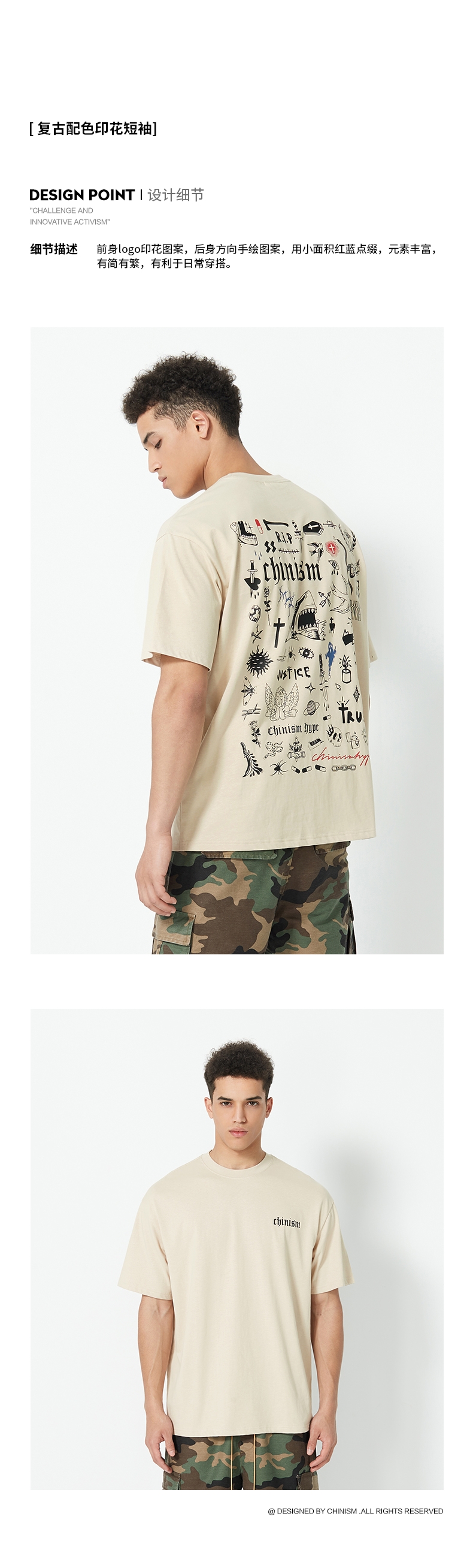 CHINISM 2020AW 水洗做旧长袖t恤男潮牌字母交叉印花潮流宽松上衣 米黄色 S,M,L,X$90.00