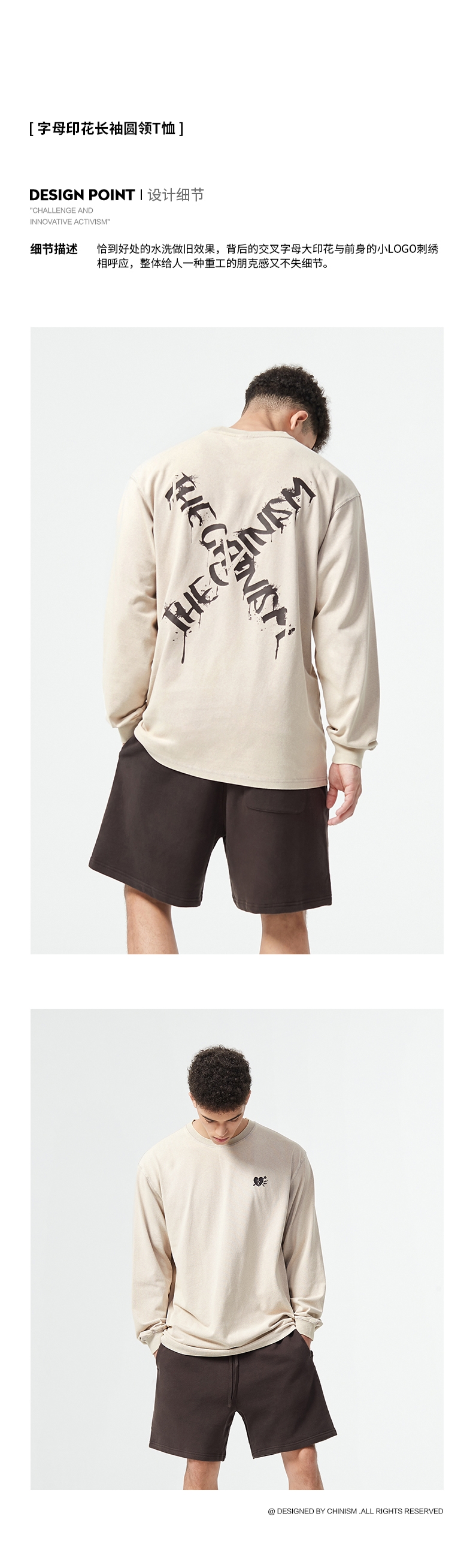 CHINISM 2020AW 水洗做旧长袖t恤男潮牌字母交叉印花潮流宽松上衣 米黄色 S,M,L,X